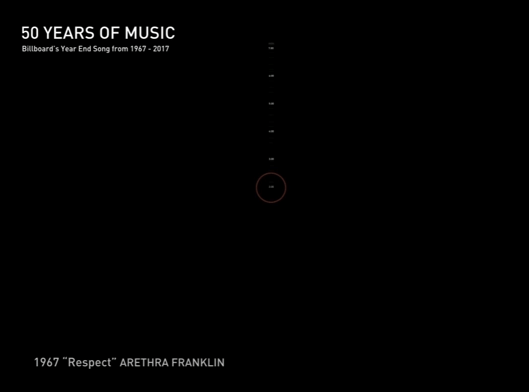 Each ring represents all 50 top songs, where the color shows the genre, diameter depicts the duration, and the density of wave represents the beats per minute (BPM) of the song. There’s also an interactive component where the user can experience the history of each song, the .gif shown is a quick timelapse of the first few songs (sans music).